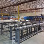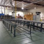 The Belt Conveyor is spaced to handle parts from 36” to 16’ long. Certain profiles that are prone to tipping will need assistance during the transfer process. The Transfer Conveyor consists of powered conveyor rollers, with pop-up transfer belts, 90° to the Belt Conveyor.